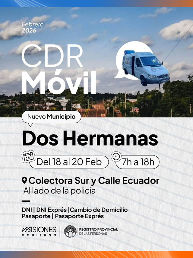 AGENCIA MISIONES.UNO | El ministro de Gobierno, Marcelo Pérez, informó que desde este miércoles y hasta el viernes 19 se realizará en Dos Hermanas un operativo especial del Centro de Documentación Rápida Móvil para facilitar la actualización de domicilio de los vecinos, en el marco del proceso de consolidación institucional del nuevo municipio.