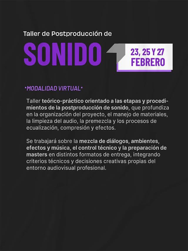 El cronograma comenzará el 23 de febrero con charlas sobre el proceso creativo desde el color y el sonido. Los talleres prácticos de postproducción en color se desarrollarán los días 24 y 26 de febrero, mientras que los de postproducción de sonido tendrán lugar el 25 y 27 de febrero, todos en modalidad virtual.