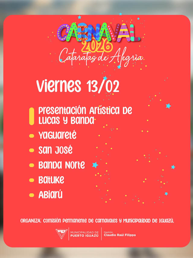 El viernes 13 se presentará el espectáculo artístico de Lucas y Banda, junto a las comparsas Yaguareté, San José, Banda Norte, Batuke y Abiarú. El sábado 14 será el turno de Abiarú, Batuke y Banda Norte, con la presentación de El Mago y La Nueva, y el cierre de las comparsas San José y Yaguareté. En tanto, el domingo 15 contará con la actuación de Esteban Gutiérrez y el desfile de Abiarú, Batuke, Banda Norte, San José y Yaguareté.